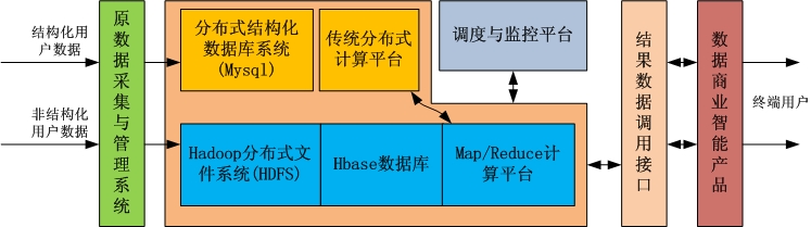 以Hadoop系列技术为代表的NoSQL技术为大数据商务智能铺就了坚实的基础,为企业解决文本、图像等非结构化数据和传统结构化数据的统一存储与运算提供了全新、高可靠、高性能的解决方案。北京铁壳恒信科技有限公司基于Hadoop技术为核心的NoSQL技术,成功搭建了电商数据应用平台,每日可处理流量日志数据5TB以上,交易数据1000万条以上。整个平台的框架如下图所示: